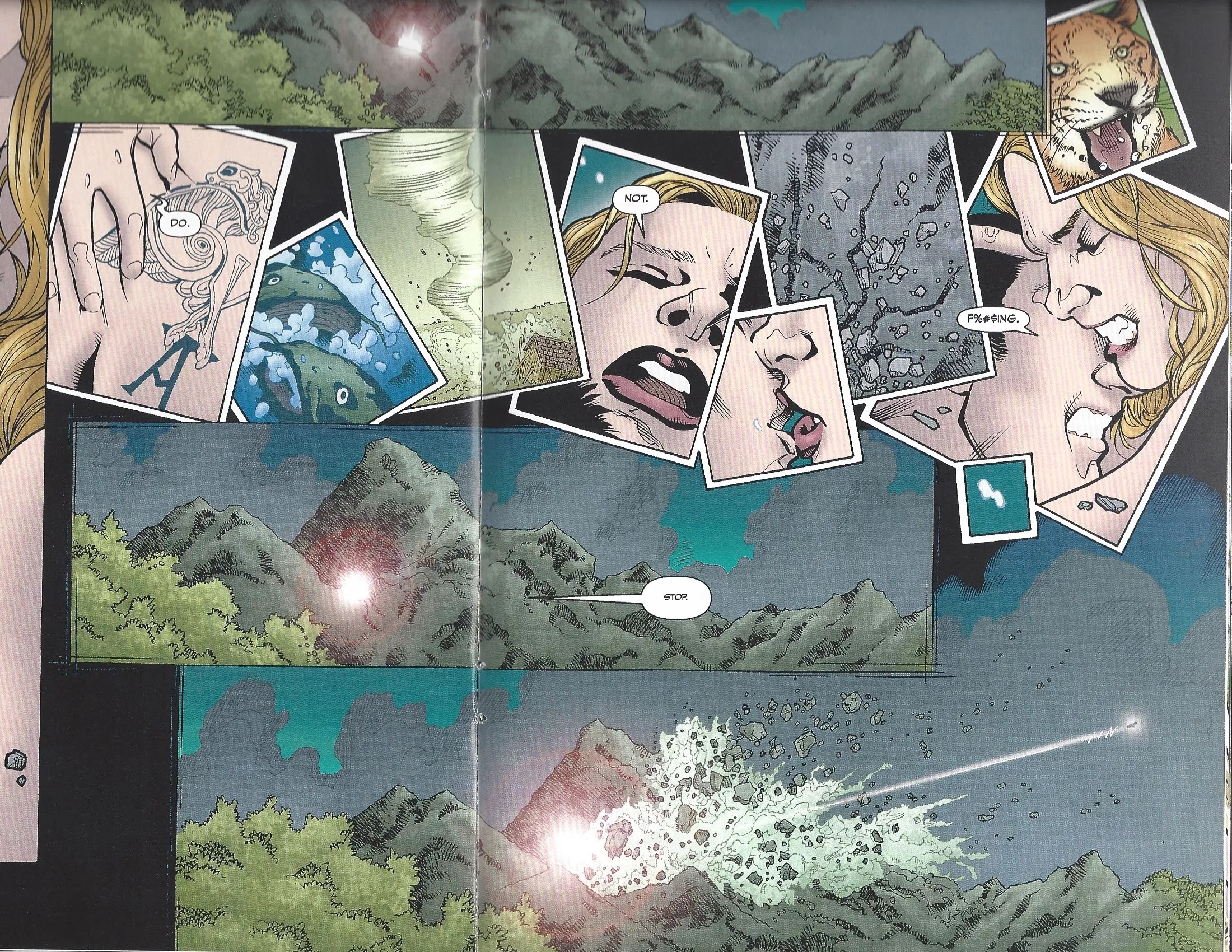 The worst bit, and the one that made me finally put down the comic because it was clearly more about Whedon getting off than the story, came during the “Twilight” arc. It’s revealed that the new bad is actually a superpowered Angel, who has been trying to kill the Slayers because I do not remember and did not bother to learn when I went through my longbox of issues. After a fight, Buffy and Angel then proceed to have earth-shattering (literally) sex for the entire length of an issue. The sub-header of the book is actually called “Them F#ยฉ%ing,” and it has the least subtle ending of anything ever drawn.