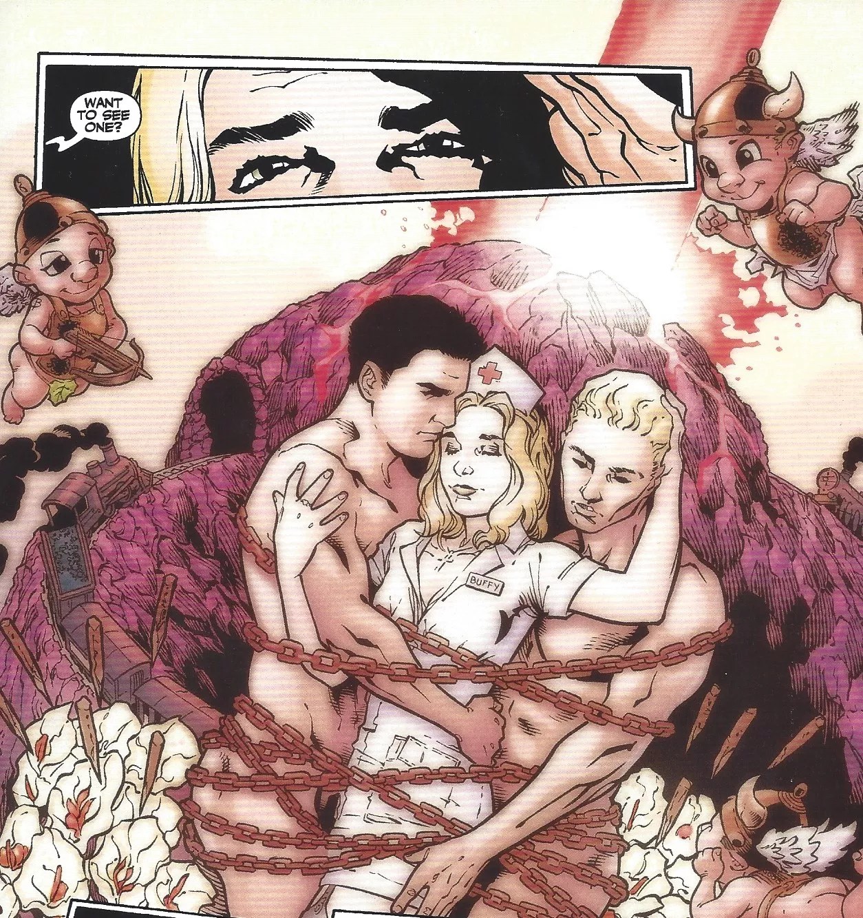 At least in the comics the majority of Buffy’s sexual experiences are apparently entirely consensual, but Whedon ups the ante with the way she is drawn. Here’s a fantasy sequence in her head where she’s in a threesome while wearing nurse gear.