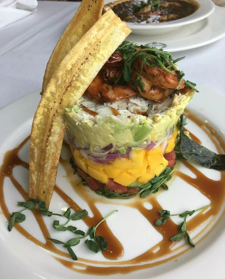 “The first week after Hurricane Harvey, we went down to Dickinson to help our friends pack up what belongings had been saved after three feet of water flooded their home,” writes Lorretta Ruggiero (read her Harvey Hangover tale here). “Later we ended up, kids in tow, at Marais along the Dickinson Bayou. After days of junk food, it was nice to eat food that was fresh and vibrant. We adults decided to share a number of appetizers so that we could get a taste of the restaurantโs offerings. The best thing we ate was the lump crab and shrimp tower. We carefully tucked in, making sure to get all of the ingredients in a bite. The sweetness of the crab was enhanced by the citrusy sweetness of the diced mango and the creamy avocado. There were only two shrimp, but those were snagged by someone else, so I didnโt get to taste them, but thatโs okay. More crab for me. The second best thing was the crab beignets. We were concerned that they might be heavy, but they were actually quite light, letting the taste of the blue crab come through the pastry, and only needed a tiny dab of the rรฉmoulade sauce to give it a little extra flavor. It was a welcome meal after days of wine and Doritos.”